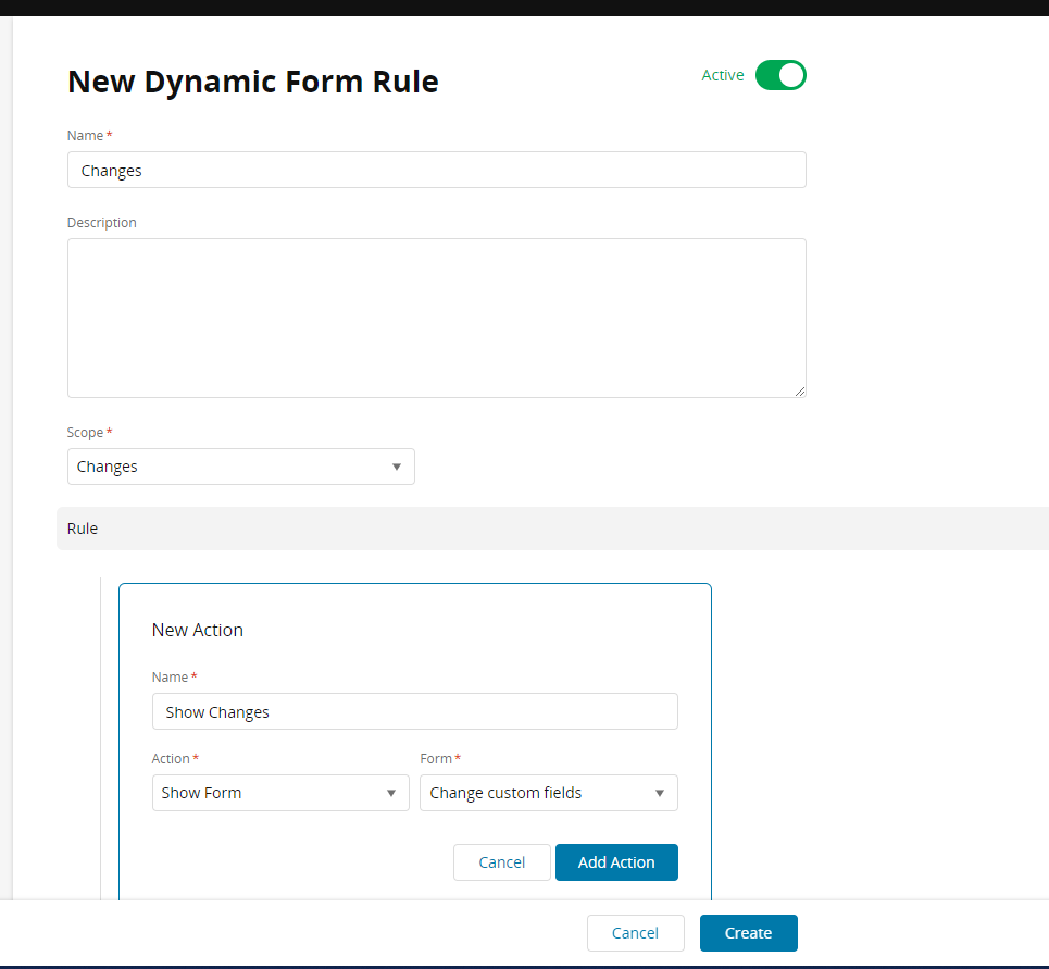 Hello there @abhishek-robomq .....in order to see the custom fields, please create the Dynamic Form Rule to Show the custom form. Setup > Service Desk > Dynamic Form Rule and click the plus sign in the top right. Enter a name for the rule, choose Change from Scope, click the plus sign to choose Action, name the Action Show Changes, and Action = Show Form / Form = Name of your Custom Form (Changes in your example). Click Add Action and then Create. You should see the custom fields in your Change record.