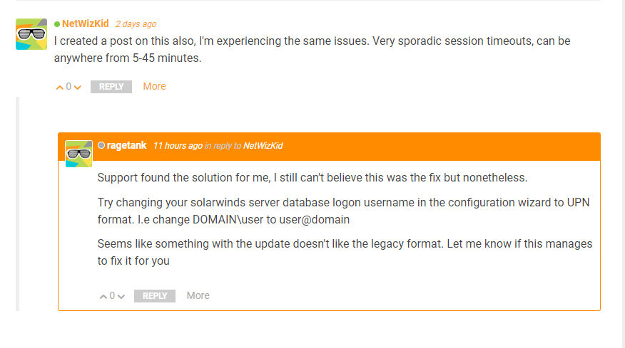 We just upgraded from SolarWinds 2022.4 to the recommended 2023.4 RC1 platform and now the web console times out randomly. It last anywhere from a few minutes up to 45ish minutes. Typically right before the session times out we will get "There was an error rendering resource with id #" and typically "your session has timed out" at which point you have to refresh the page and sign on again. This issue started occurring right after we upgraded. Checked accounts and web console timeout settings and all were set correctly. We increased the web page timeout in IIS and that did not make a difference. We have an open ticket with SolarWinds now and I'm hoping this gets figured out soon because it's pretty hard to monitor when it logs us out every 5-30 minutes on average. We did not encounter any issues during the upgrade and it seemed as though everything was gonna go without a hitch, but of course that never happens in our field
