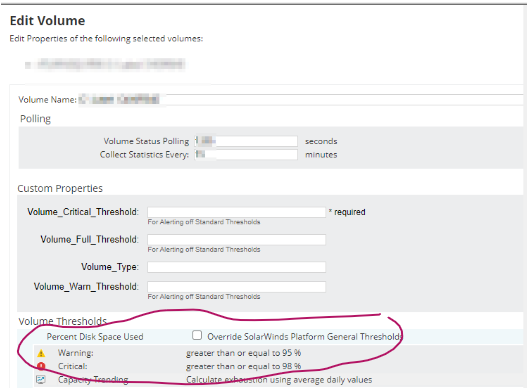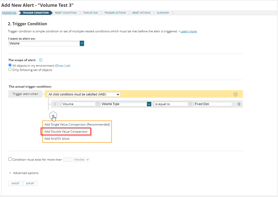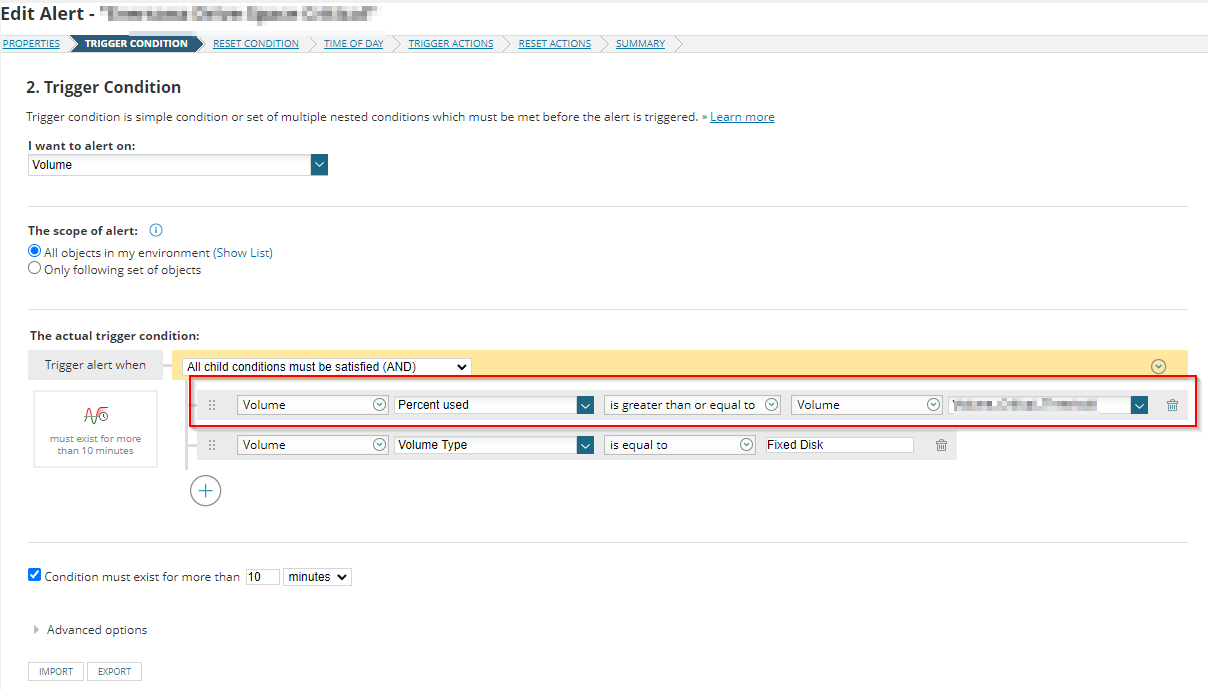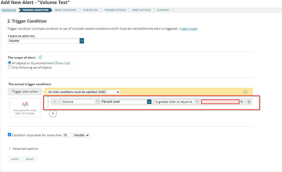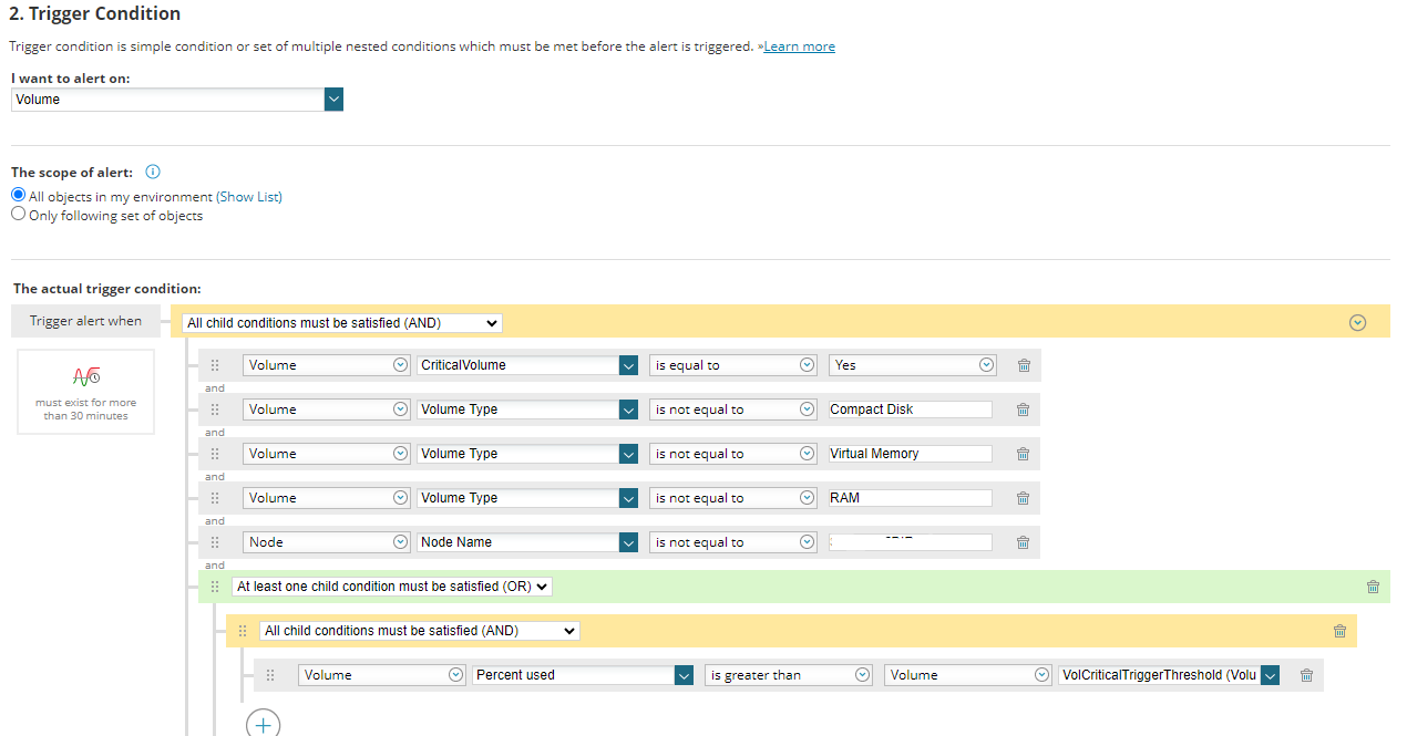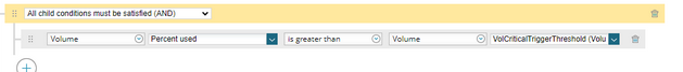 I am trying to setup a different volume alert using a floating point custom property for drive space. I currently have critical and full alerts setup. I was trying to work on setting up an additional alert but ran into an issue.