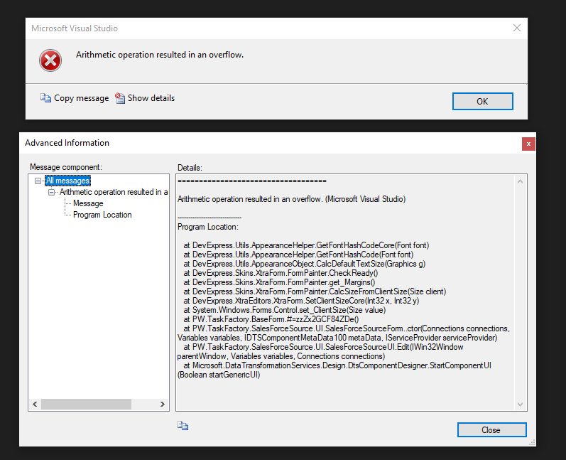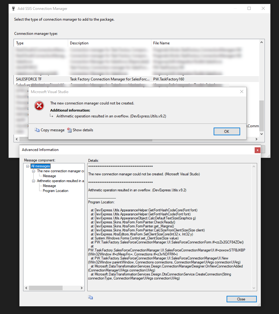 We're using Visual Studio 2022 and when you right-click > Edit the salesforce connector, it throws an error "Arithmetic operation resulted in an overflow".