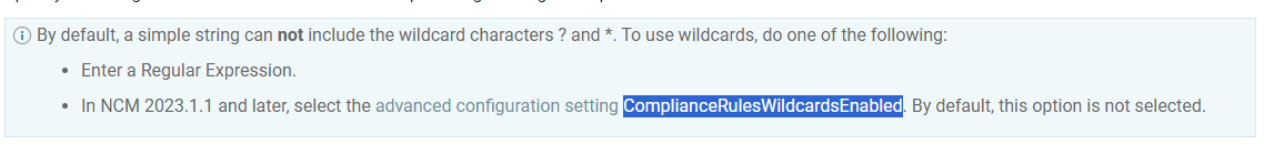 We would like to use Wild Cards ( * and ? ) in compliance rules. We see that this can be enabled in advanced configuration...
