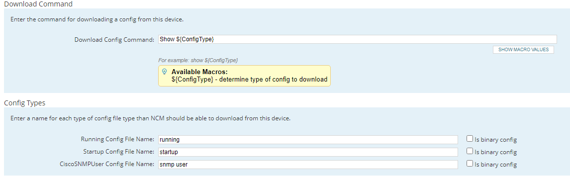 This is where it might be a bit tricky for you. The "Download config command" probably has something like "Show ${ConfigType}" with the macro ${ConfigType} relating to the config types defined in the section below. In my case, the "Running Config File Name" was "running", so the config command gets expanded to "Show running". In the case of our new configuration type, we want the command to be "show snmp user", so in the 3rd box for "CiscoSNMPUser Config File Name", we need to put in "snmp user". So, it should look something like this: