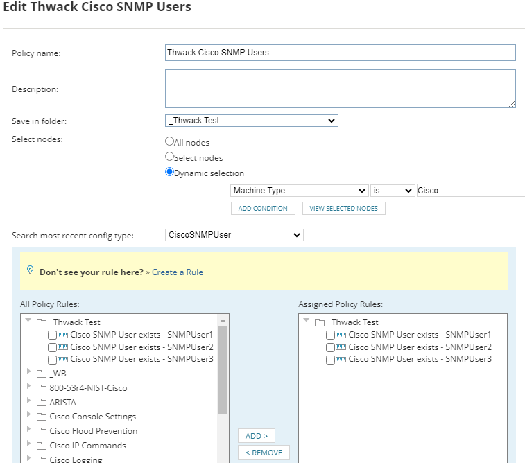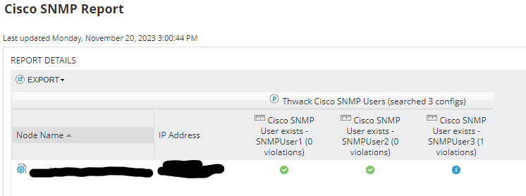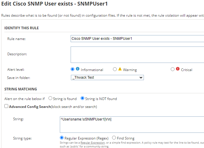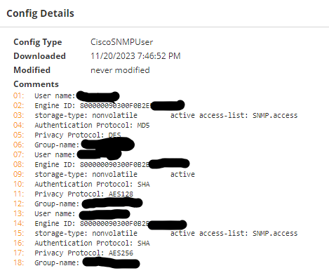 With most Cisco IOS devices, and possibly other devices, they removed the SNMP users from the configuration for some sort of security purposes, this is true of things like certificates also. We have another application here that uses different SNMP credentials than our network management does, but have been having problems with those credentials being set up incorrectly. Until I realized that they weren't in the config I was thinking Compliance Rules, but once I realized they weren't there I started going down the roads of trying to figure out how to write scripts and maybe couple them with API programming to do this. No path looked very easy, so I kept contemplating which might be the best way.