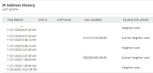 I have turned on neighbor scanning for the affected subnet (fortunately, it's mostly all within a single subnet), but that brings its own issues. IPAM does indeed retrieve the mac addresses through neighbor scanning, but the next subnet scan overwrites them so they aren't readily available (other than via history). We have both automatic scanning and neighbor scanning enabled; should these be mutually exclusive? The documentation is, of course, quite sparse on these kinds of details.