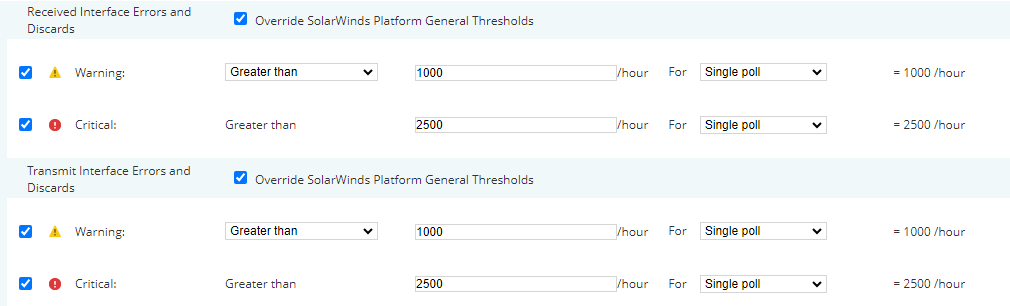 Our Cisco switches occasionally (during busy login times in the morning and afternoon) have a high number of "In/Out Errors and Discards" on some interfaces. We have already investigated this and have found that this is not a problem. However, it is now the case that our switch is always marked as red and critical when this happens. This is of course very annoying if this happens several times a day and it is actually a harmless problem.