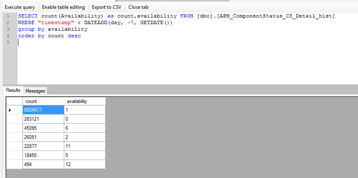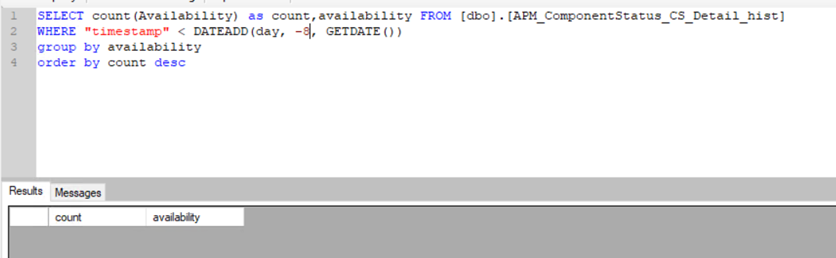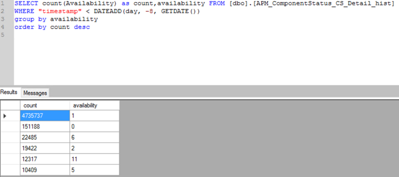 SELECT count(Availability) as count,availability FROM [dbo].[APM_ComponentStatus_CS_Detail_hist]