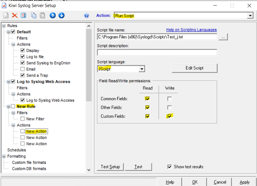 In the example, I have added some more actions to the rule to log the Syslog to a log file