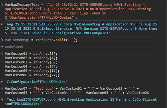 VarCustom01 = strArray[8]; (Adding the splitted message into variables, Only the required parts needs to be added into the variables)