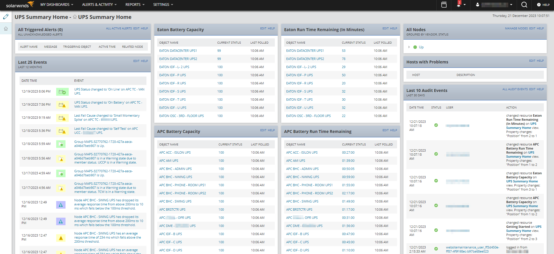 Hello all, I haven't been working with Solarwinds for very long, only a few months. In that time I've managed to piece together this little dashboard that allows me to monitor reported battery capacity and reported runtime on APC and Eaton UPS within our environment.