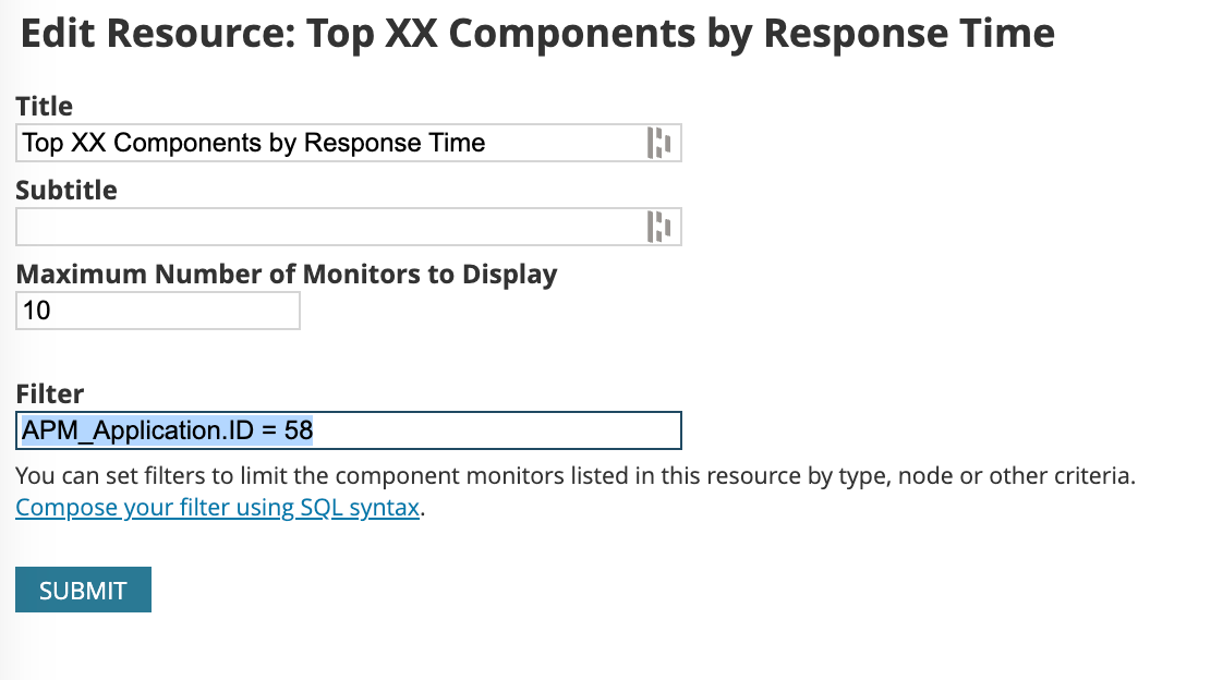 I'm trying to use the application ID I'm browsing to filter the resource. I've done this with node reports, using the "NodeID = ${NodeID}" macro, but can't seem to get this to work, and can't find a good resource that explains how I should be constructing this filter.