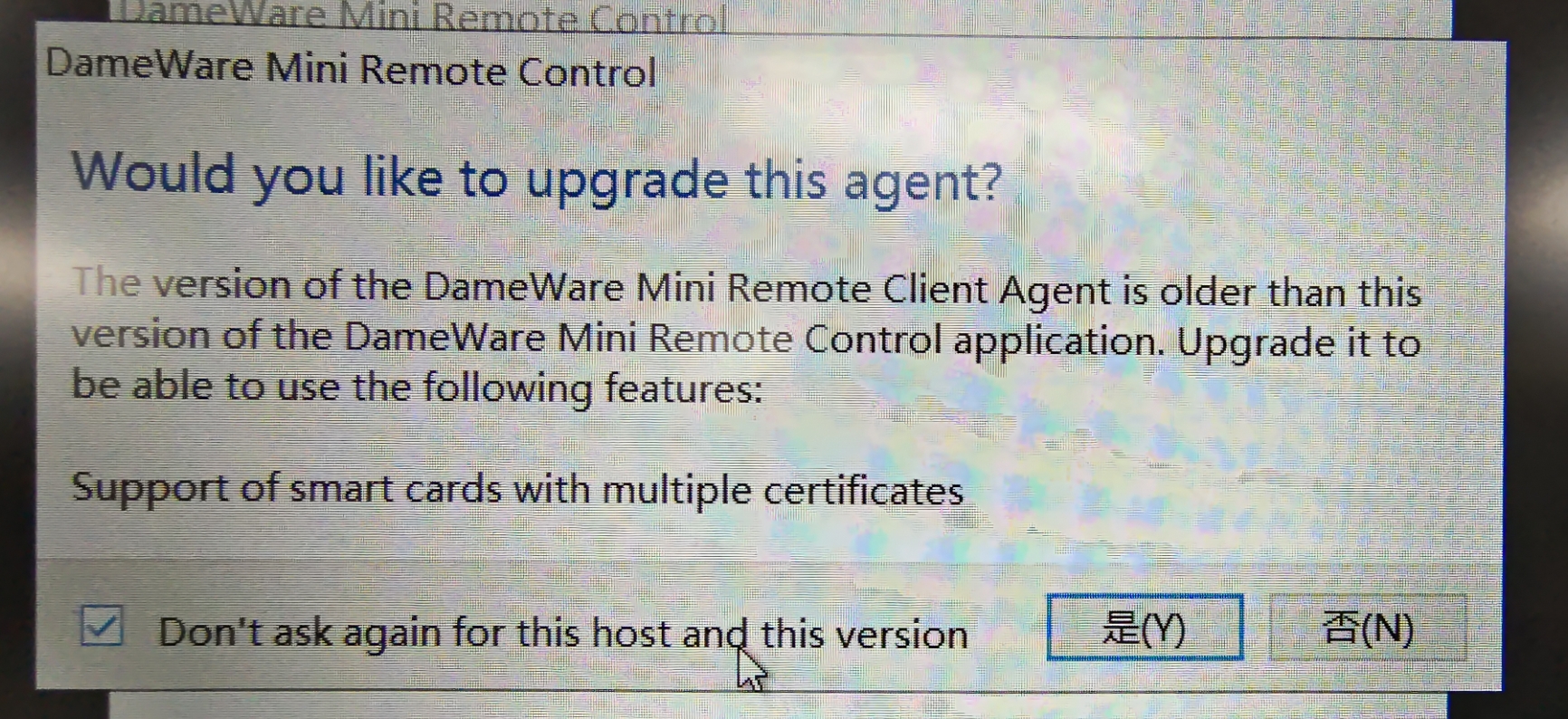 I have a problem recently about the pop-up window. In my PC the dameware mini control version is 12.1 , but the remoted server agent version is 9.0. So everytime I remote to the server , there is a pop-up window just like the picture to notify me to update the agent.
