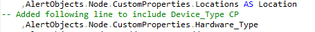 SELECT DISTINCT AlertActive.AlertActiveID, AlertObjects.AlertObjectID, AlertConfigurations.Name, AlertConfigurations.Severity, AlertConfigurations.ObjectType, AlertObjects.EntityUri, AlertObjects.EntityType, AlertObjects.EntityCaption, ToLocal(AlertActive.TriggeredDateTime) AS TriggeredDateTime, AlertObjects.LastTriggeredDateTime, AlertActive.TriggeredMessage AS Message, AlertActive.AcknowledgedDateTime, AlertActive.Acknowledged AS Acknowledged, AlertActive.AcknowledgedBy, AlertActive.AcknowledgedNote, Case When Floor((SecondDiff(AlertActive.TriggeredDateTime,GetUtcDate()) + 0.0)/86400)>0 Then ToString(ToString(Floor((SecondDiff(AlertActive.TriggeredDateTime,GetUtcDate()) +0.0)/86400))+'d '+ ToString(Floor(((SecondDiff(AlertActive.TriggeredDateTime,GetUtcDate()) - 86400*(Floor((SecondDiff(AlertActive.TriggeredDateTime,GetUtcDate()) + 0.0)/86400))) + 0.0)/3600))+'h '+ ToString(Floor(((SecondDiff(AlertActive.TriggeredDateTime,GetUtcDate()) - 3600*(Floor((SecondDiff(AlertActive.TriggeredDateTime,GetUtcDate()) + 0.0)/3600))) + 0.0)/60))+'m ') When Floor(((SecondDiff(AlertActive.TriggeredDateTime,GetUtcDate()) - 86400*(Floor((SecondDiff(AlertActive.TriggeredDateTime,GetUtcDate()) + 0.0)/86400))) + 0.0)/3600)>0 Then ToString(ToString(Floor(((SecondDiff(AlertActive.TriggeredDateTime,GetUtcDate()) - 86400*(Floor((SecondDiff(AlertActive.TriggeredDateTime,GetUtcDate()) + 0.0)/86400))) + 0.0)/3600))+'h '+ ToString(Floor(((SecondDiff(AlertActive.TriggeredDateTime,GetUtcDate()) - 3600*(Floor((SecondDiff(AlertActive.TriggeredDateTime,GetUtcDate()) + 0.0)/3600))) + 0.0)/60))+'m ') When Floor(((SecondDiff(AlertActive.TriggeredDateTime,GetUtcDate()) - 3600*(Floor((SecondDiff(AlertActive.TriggeredDateTime,GetUtcDate()) + 0.0)/3600))) + 0.0)/60)>0 Then ToString(ToString(Floor(((SecondDiff(AlertActive.TriggeredDateTime,GetUtcDate()) - 3600*(Floor((SecondDiff(AlertActive.TriggeredDateTime,GetUtcDate()) + 0.0)/3600))) + 0.0)/60))+'m ') Else '' End AS ActiveTime, AlertObjects.Node.caption as Node,AlertObjects.Node.CustomProperties.Locations as Location, AlertObjects.Node.IPAddress as IPAddress, AlertObjects.Node.Vendor as Vendor,AlertObjects.Node.MachineType as MachineType FROM Orion.AlertObjects (nolock=true) AlertObjects INNER JOIN Orion.AlertActive (nolock=true) AlertActive ON AlertObjects.AlertObjectID=AlertActive.AlertObjectID INNER JOIN Orion.AlertConfigurations (nolock=true) AlertConfigurations ON AlertConfigurations.AlertID=AlertObjects.AlertID Order By AlertConfigurations.Name, AlertObjects.EntityCaption