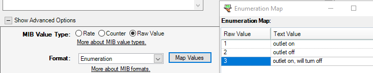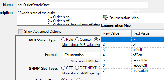 I am polling a GEIST PDU for the state of the Outlets (OID Name: pduOutletSwitchState / MIB 1.3.6.1.4.1.21239.5.2.3.5.1.4) and it returned with numeric values: 1,2,3,4,5