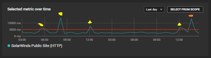 - The alert triggers during peaks (marked with yellow and orange dots) where the metric exceeds the threshold.