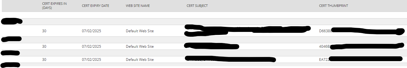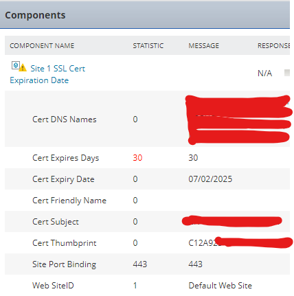 The statistical data for "Cert DNS Names, Cert Expiry Date, Cert Friendly Name, Cert Subject, Cert Thumbprint" is set to 0 (zero) as is the string value you are interested in."Cert Expires Days" is the amount of days before the Certificate will expire."Site Port Binding" is the SSL port number assigned to the website (useful if it's not the default 443"Web SiteID" will be the IIS Site ID number.