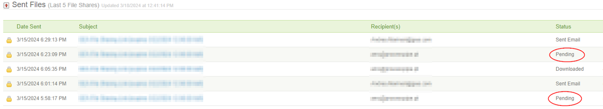 Hi, I have a user who has sent a handfull of files to an external contact. When he looks at his "Sent files" overview, 2 files have status "Sent Email", 1 is "Downloaded" and the last 2 are "Pending". These last 2 files have been "Pending" for 4 days now and the recipient has not received the link to the "Pending" files yet.