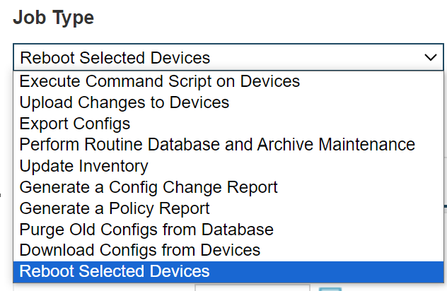 When I create an NCM job, I get the following job type drop-down. Where can I find the underlying commands for the Reboot Selected Devices job type.? It is not listed under templates or scripts.