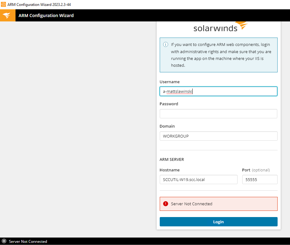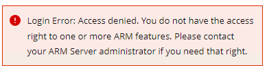 It says "Login Error: Access denied. You do not have the access right to one or more ARM features. Please contact your ARM Server administrator if you need that right. Server Not Connected"