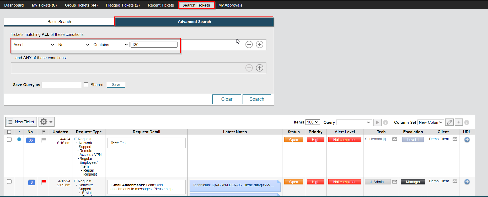 Hey@"itice.allegany" , You can definitely search tickets based on asset details! In "Search Tickets", there's an "Advanced Search" option (see image below) that allows filtering by asset number, model, serial number, and custom fields.