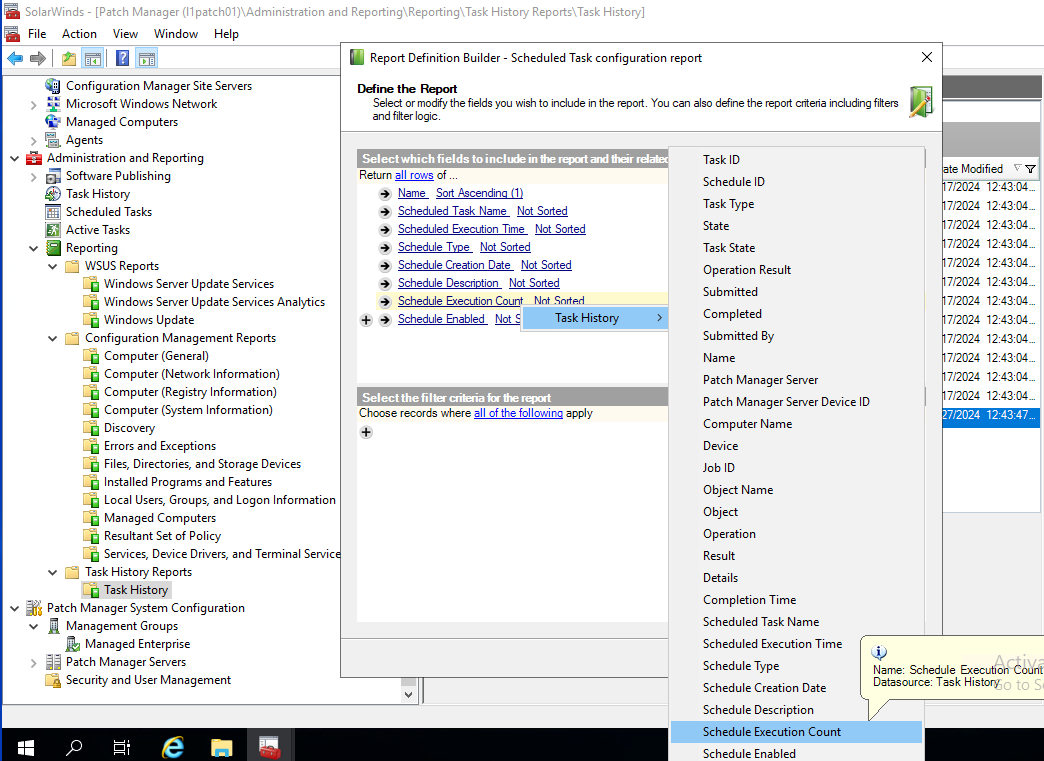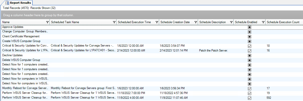 I would like to automate QA on some external tasks related to our patching. PM is our source of truth for the server patch schedules. I cannot find any tables in the DB that might relate to these scheduled job configs. No API. How can this be? The config data must be stored somewhere! Can I access it outside the GUI? Is there a report I can make to give me configs? I only see results and inventory reports. Am I really supposed to just eyeball everything like a plebeian?