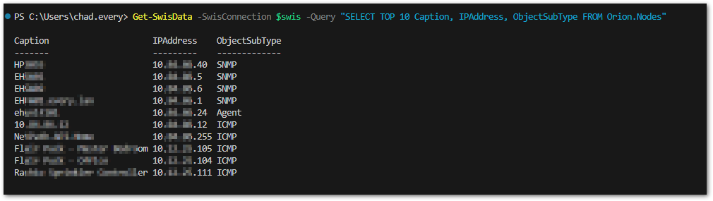 Get-SwisData -SwisConnection $swis -Query "SELECT TOP 10 Caption, IPAddress, ObjectSubType FROM Orion.Nodes"