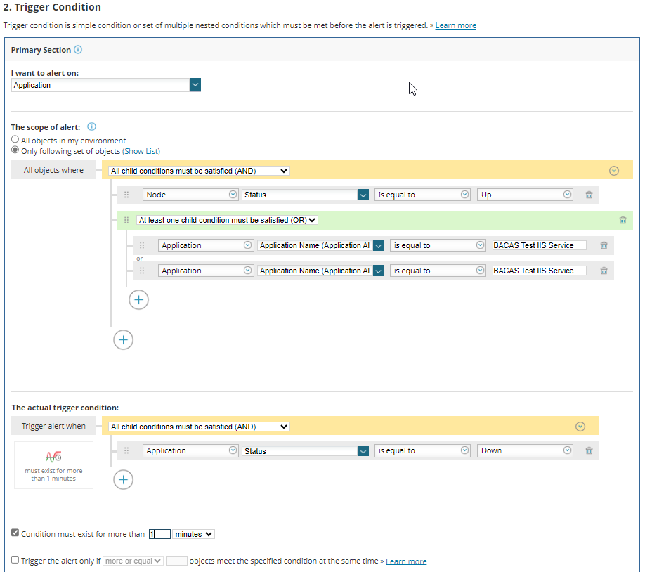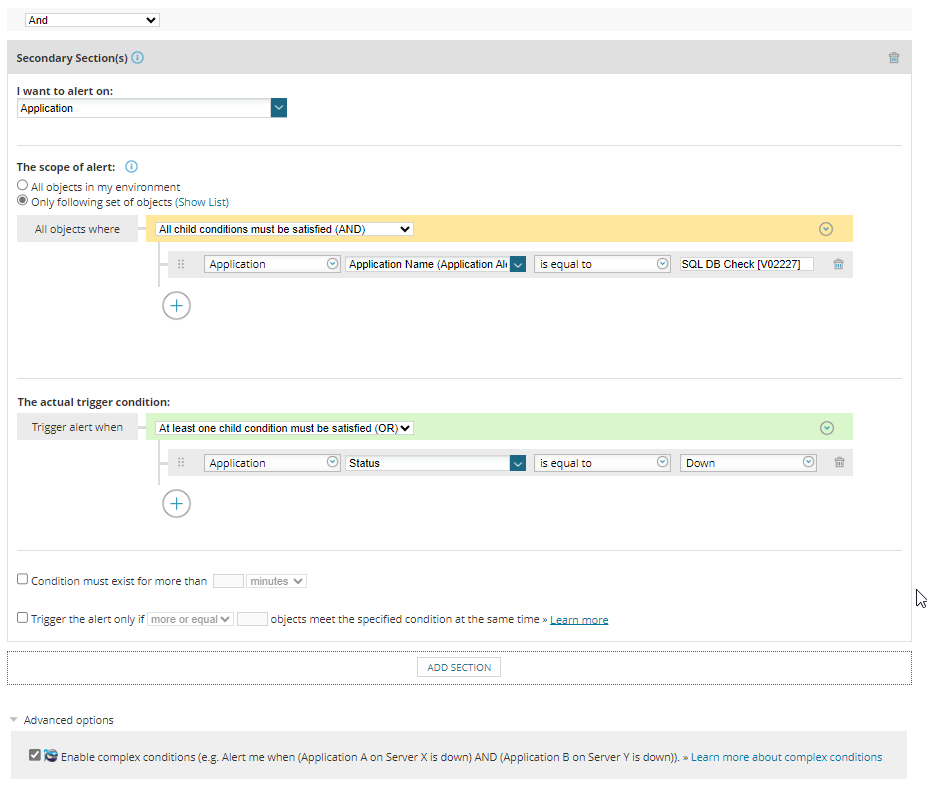 I'm trying to use a complex condition to first check if a database is up and then check if the application is down.