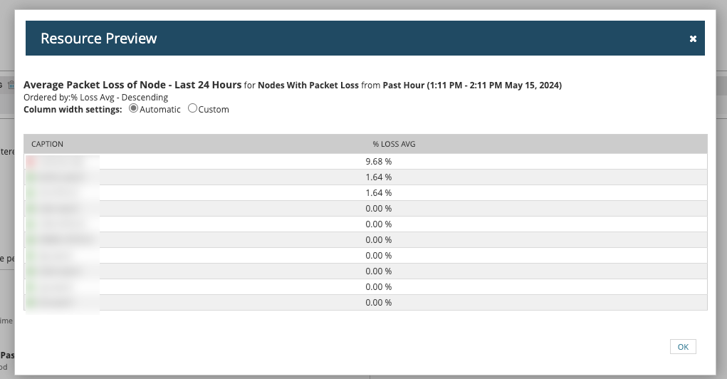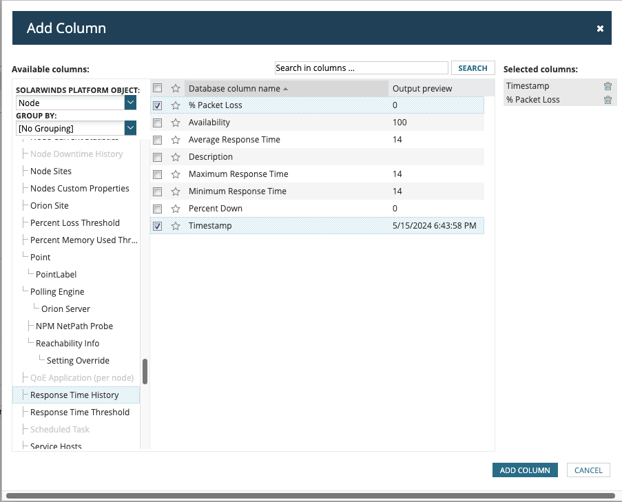 I have a report setup to show a table of nodes with packet loss issues. My only problem is, I cannot get the data to include only nodes with packet loss issues. It either shows all or none... I'm currently using the Dynamic Query Builder but I suspect I would need to convert to SQL/SWQL to get the outcome I'm looking for.