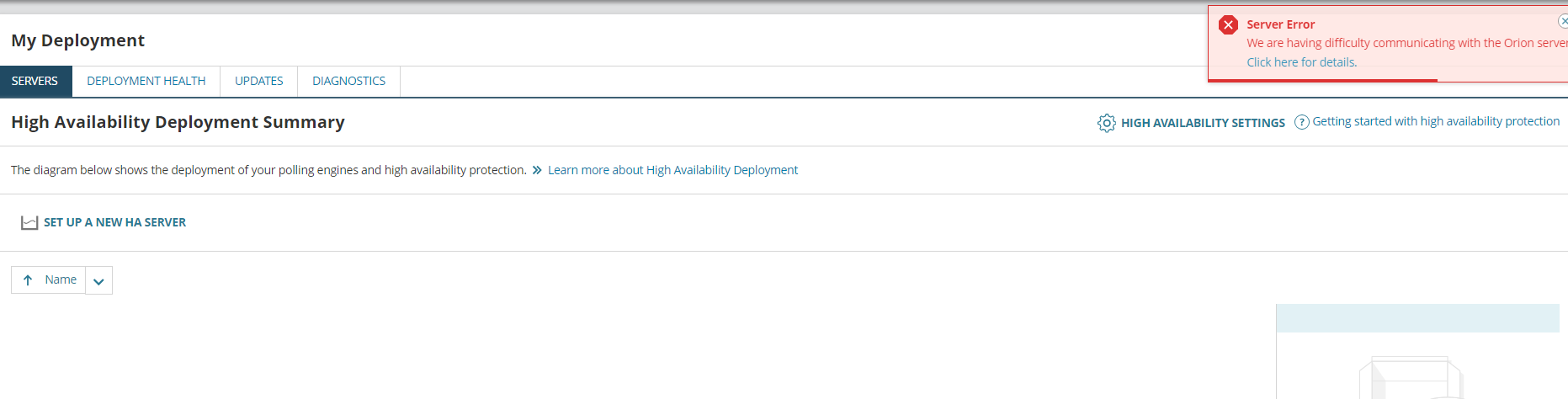 I saw a Server error on My Deployment page. When I click on my deployment and go to Servers or deployment health, it shows me this error. However, apart from this my entire SolarWinds is working fine except this page. Any idea what can be the work around or some hints where I can check the logs to identify the issue please?