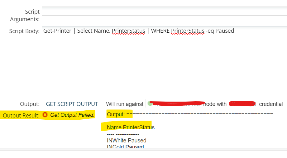 I got below powershell script to get the paused printer status, and I am using this under Windows Powershell component. while checking the output its returning the right output however the output result shows as Get output failed error as highlighted in below screenshot.