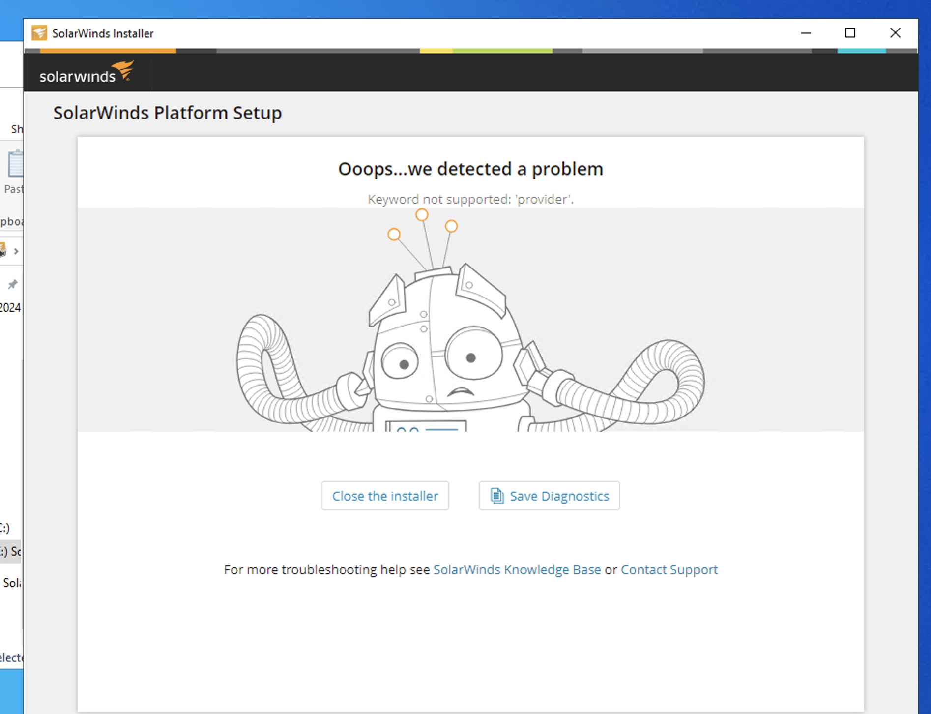 Hi everyone, Need help. I can't run installer of Orion platform version 2024.1.1 (NPM, NTA, AWS, APE) error name is keyword not supported 'provider'. I have install on VM Server with OS windows server version 2022 datacenter.