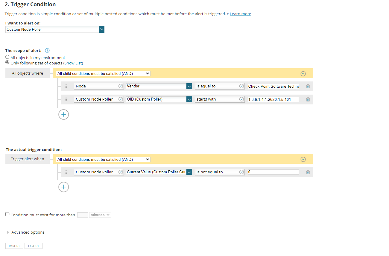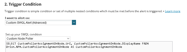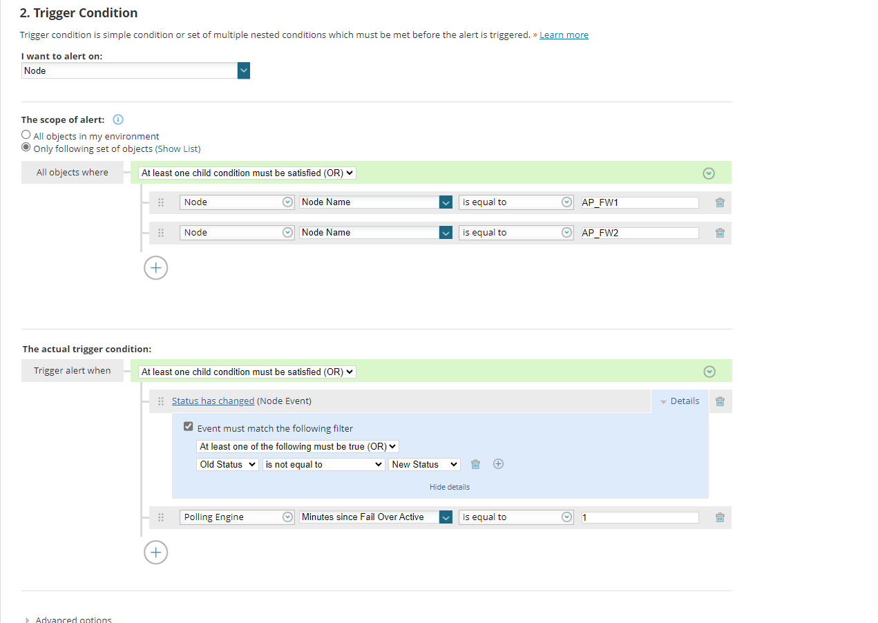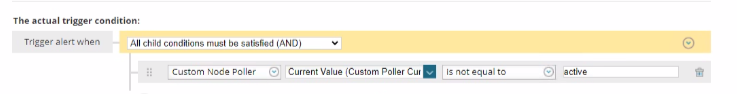 What you now need to do is identify the differences between the node in service and the one that isn't. So if Node 1 (for eg) shows a result of 0 for your HA OID and the failover has a different result, and on failing over those results change then you should then be able to use that result as a part of your trigger. We do a very similar thing for Fortinets, and it took me a while to get there but this is what we do:Setup your trigger condition as below. Once you select the two dropdowns as per the image, you'll get a bit of pre-built SWQL - a la: