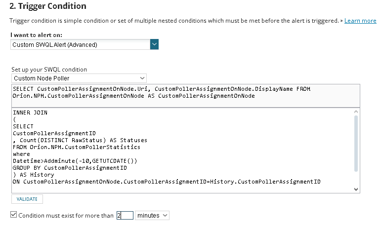 INNER JOIN(SELECTCustomPollerAssignmentID, Count(DISTINCT RawStatus) AS StatusesFROM Orion.NPM.CustomPollerStatisticswhereDatetime>Addminute(-10,GETUTCDATE())GROUP BY CustomPollerAssignmentID) AS HistoryON CustomPollerAssignmentOnNode.CustomPollerAssignmentID=History.CustomPollerAssignmentIDWHERECustomPollerAssignmentOnNode.CustomPollername='Fortigate_HA_State_Change'AND History.Statuses>1