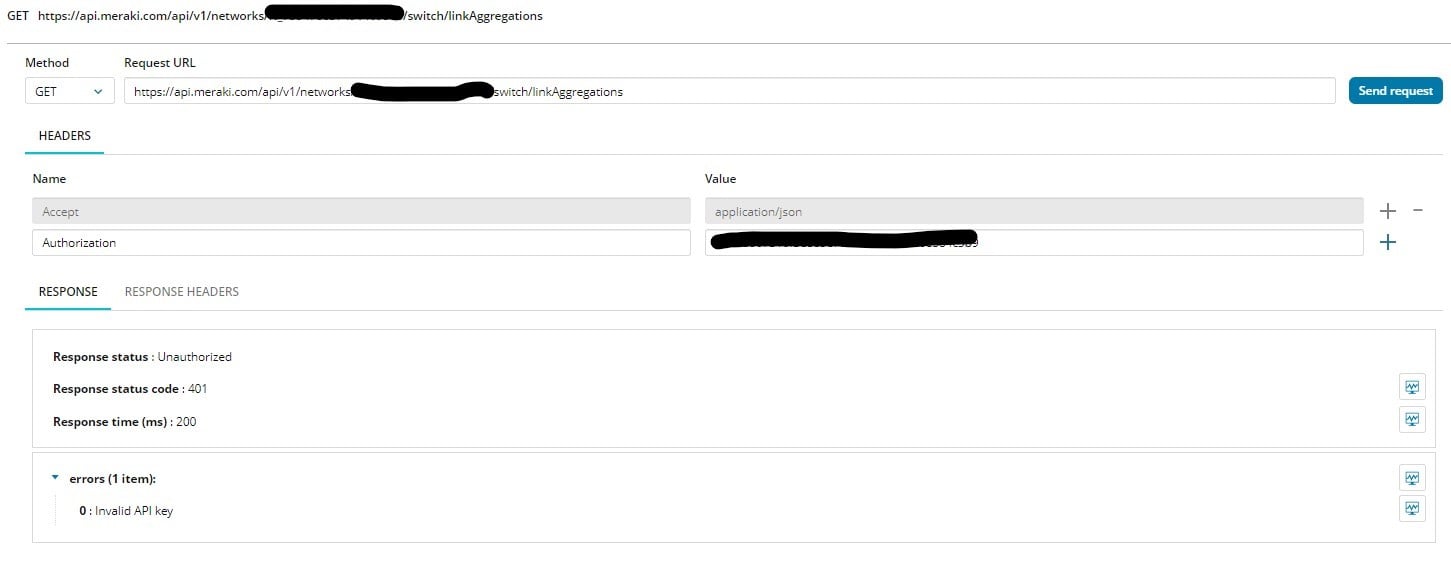 Looking to add a custom api poller for one of my Meraki switches. I am new to API so don't shoot me. When I go into the API Poller Management - Create, I add the API url for Meraki (https://api.meraki.com/api/v1/networks/<network id>), add the header name Authorization with value <my api key> then click Send Request. It returns a 401 status code for Invalid API Key. This key is good and right because I use it in Python and it works just fine.