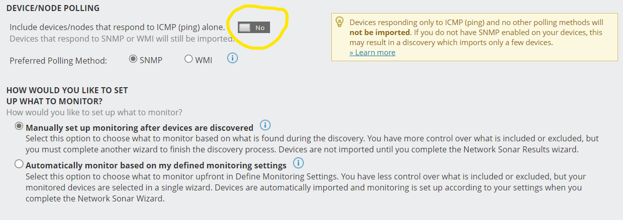 My network discovery jobs are running, and detecting when a device was ICMP but now is either WMI or SNMP enabled but is not auto converting those devices to the new method - even though the discovery is set to auto import.