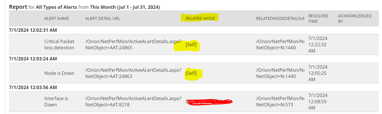 I am looking to create a report that shows all the active alerts triggered in our solarwinds environment, as well as the details of acknowledged alerts and the users who acknowledged them.