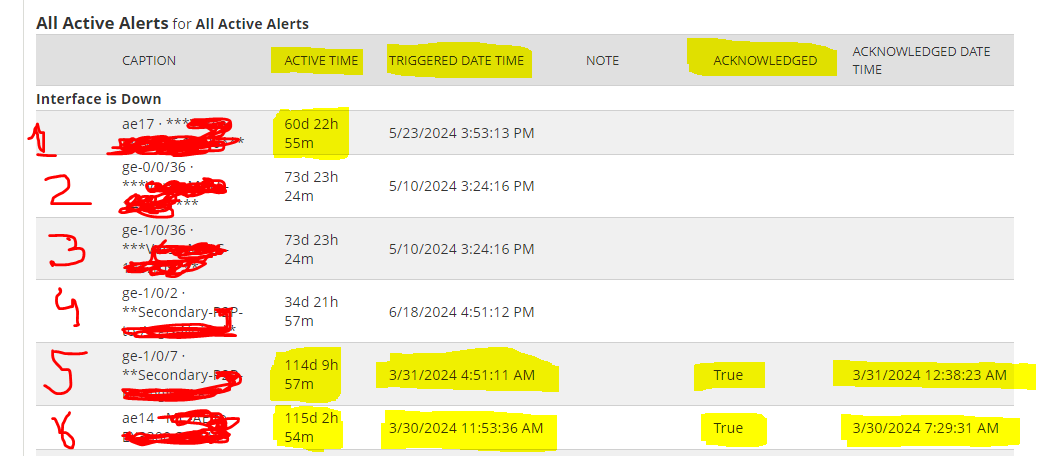 1. In points no.1, 2, 3 & 4 it's showing alert active time is 60d 22h 55m, I want to know why it's showing like this as the issue is already resolved.