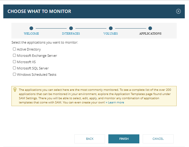 Installing from SCCM. I have the SCCM deployment working, but we do not want to use SAM monitoring. When you deploy the agent manually from SolarWinds, it will ask you what resources you want to monitor before adding the node.