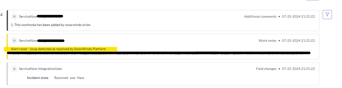 SolarWinds-ServiceNow Integration Issues - unusual work notes are added in ServiceNow "Alert reset - issue detected as resolved by SolarWinds Platform & Alert URL"