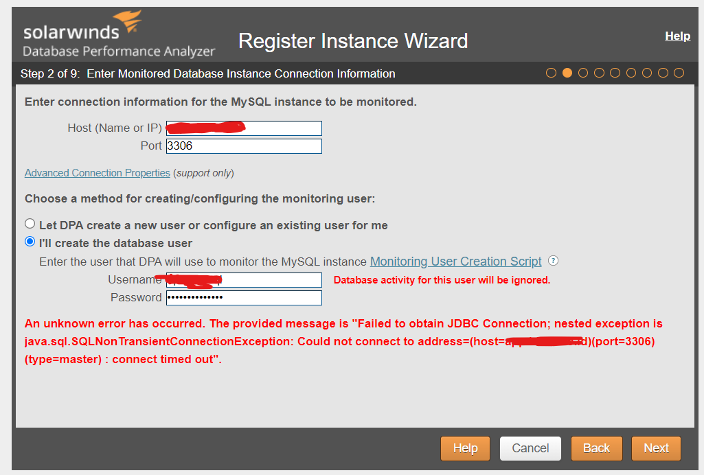 Connection timed out usually means that DPA cannot talk to the MySQL server. On the DPA system, open powershell and check if this command succeeds tnc <Server> - port <PortNumber> (without the < > brackets) example in the KB below.