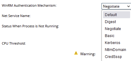 To review this go into the application monitor, edit it, scroll down and press the +button to review the settings of the appl monitor and check WinRM auth mechanism.