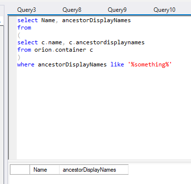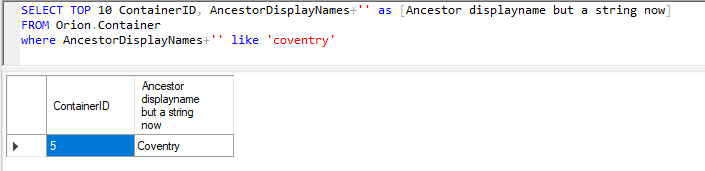 Using SWQL studio and I am unable to find a way to filter values from the AncestorDisplayNames column. The column is just a string but all the values are in the format of [value]. In my where clause, I've tried ['%value%'], '%value%', even [value] (copy and pasted) doesnt work. The query completes, however it produces no values.