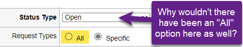 - You can no longer make a template be available in ALL situations - this is because you now MUST tie a template to BOTH a Status Type and a Request Type. At least when it comes to the "Request Type" the system allows for an "All" setting, but not for the Status Type which is SUPER frustration.