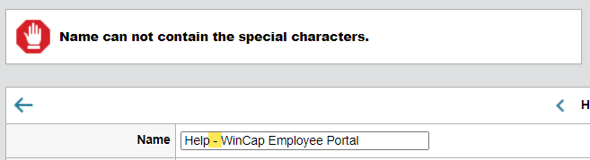 - You can no longer include special characters in the NAME of the templates - it's not clear why this would have been previously allowed and now not...but under prior versions, we had several templates that started out with "Help -" this was our way of organizing each template so that we knew those with this prefix, included links to FAQ's. They were a nice visual way to find the "FAQ" responses and send them. After this version, the templates now produce the following error that never appeared before when you attempted to save a template with a "special character" in its name: