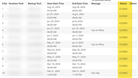 If you program a tech to be off for a full week for example, Monday the tech will be marked "On Vacation" but on Tuesday...the tech will NOT be on vacation, and won't go back on vacation for the remainder of the week. This happens visually on the second day, when you notice the "Status" column for that week shows CLOSED...meaning the program evaluated that entry...and considers the request "complete" (closed) even when the "End Date" hasn't passed for that entry:
