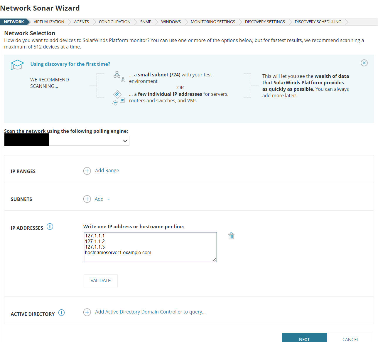 You most certainly can, have a look at this manual page: documentation.solarwinds.com/.../core-network-discovery-using-the-network-sonar-wizard-sw1574.htm
