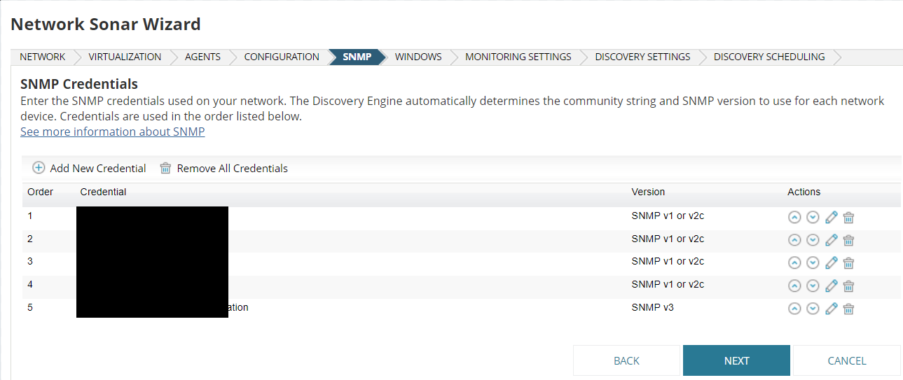 This discovery will try each string in order until it finds a match for each IP / hostname you listed. Feel free to add in the WMI credentials too, it will try SNMP then WMI credentials to find a match to add in the nodes.
