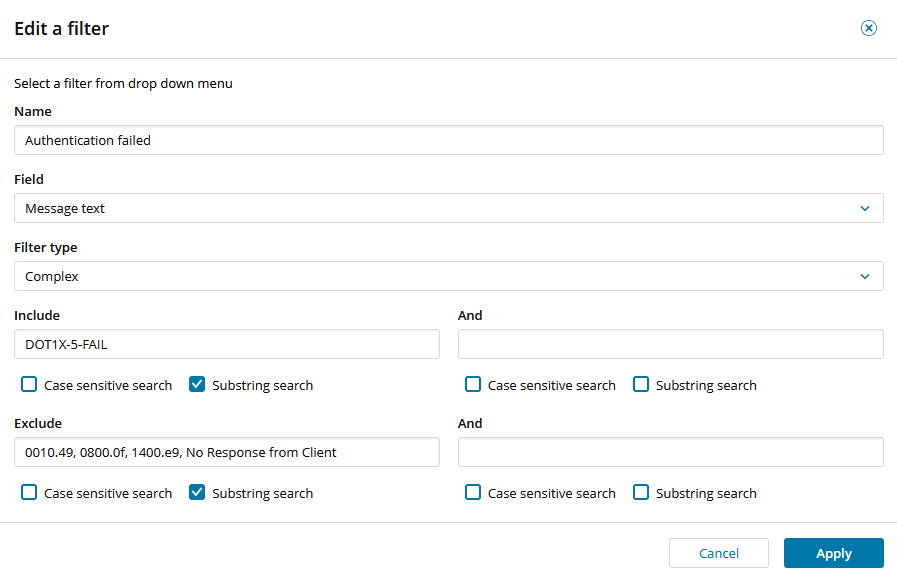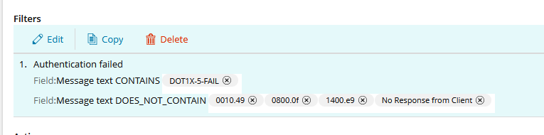 I migrated this filter rule from KSS legacy, and there are a couple issues with it in NG. I'm looking for syslog messages where DOT1X failed, but want to exclude them if the client mac starts with 0010.49, 0800.0f, or 1400.e9 (Mitel phones). This worked like a charm in legacy, but the multiple entries under the Exclude field are not working as intended in NG.