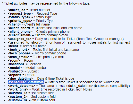 For example, on the "Action Rule" it lists <scheduled_datetime> but in the help article, it lists <scheduled_worktime> with similar but different descriptions. While the Help Article lists <ticket_url> but on the action rule that "ticket attribute" isn't even listed, but I know it works if you use it in the "Action Rule".