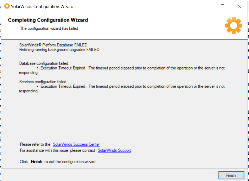 You should definitely check the ConfigurationWizard.log usually located at "C:\ProgramData\SolarWinds\Logs\Orion\ConfigurationWizard.log" for any error messages