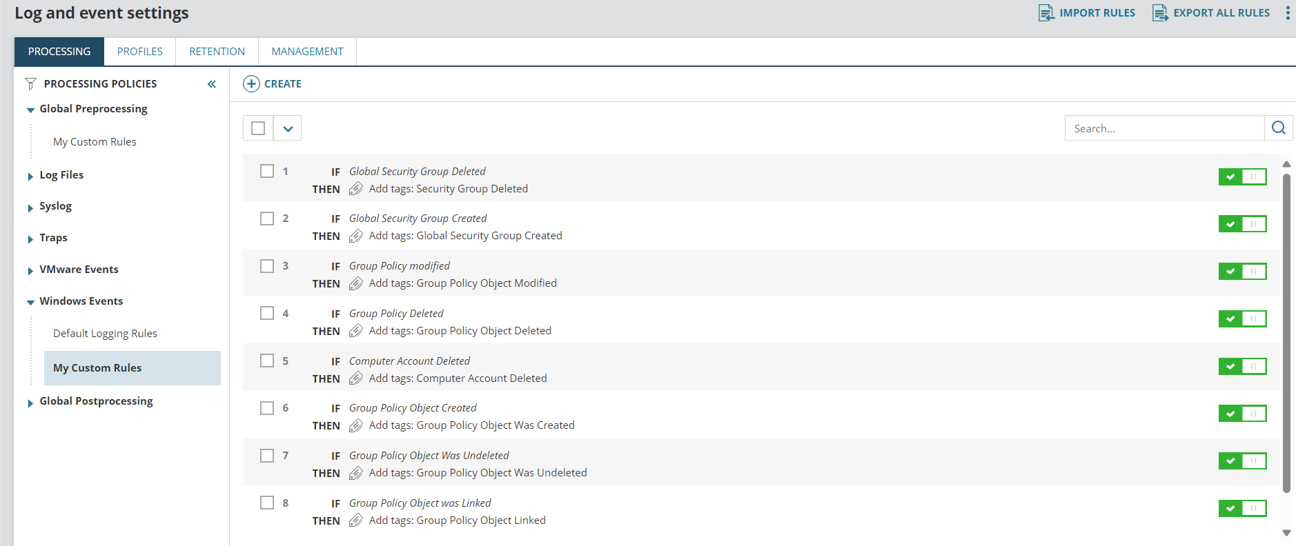 I've configured these under custom rules, everything seems to work but the the group policy stuff, I can there is pre-processing and postprocessing rules, I am not sure how they work and if the reason it's not working is somehow related to me not configuring anything in there?